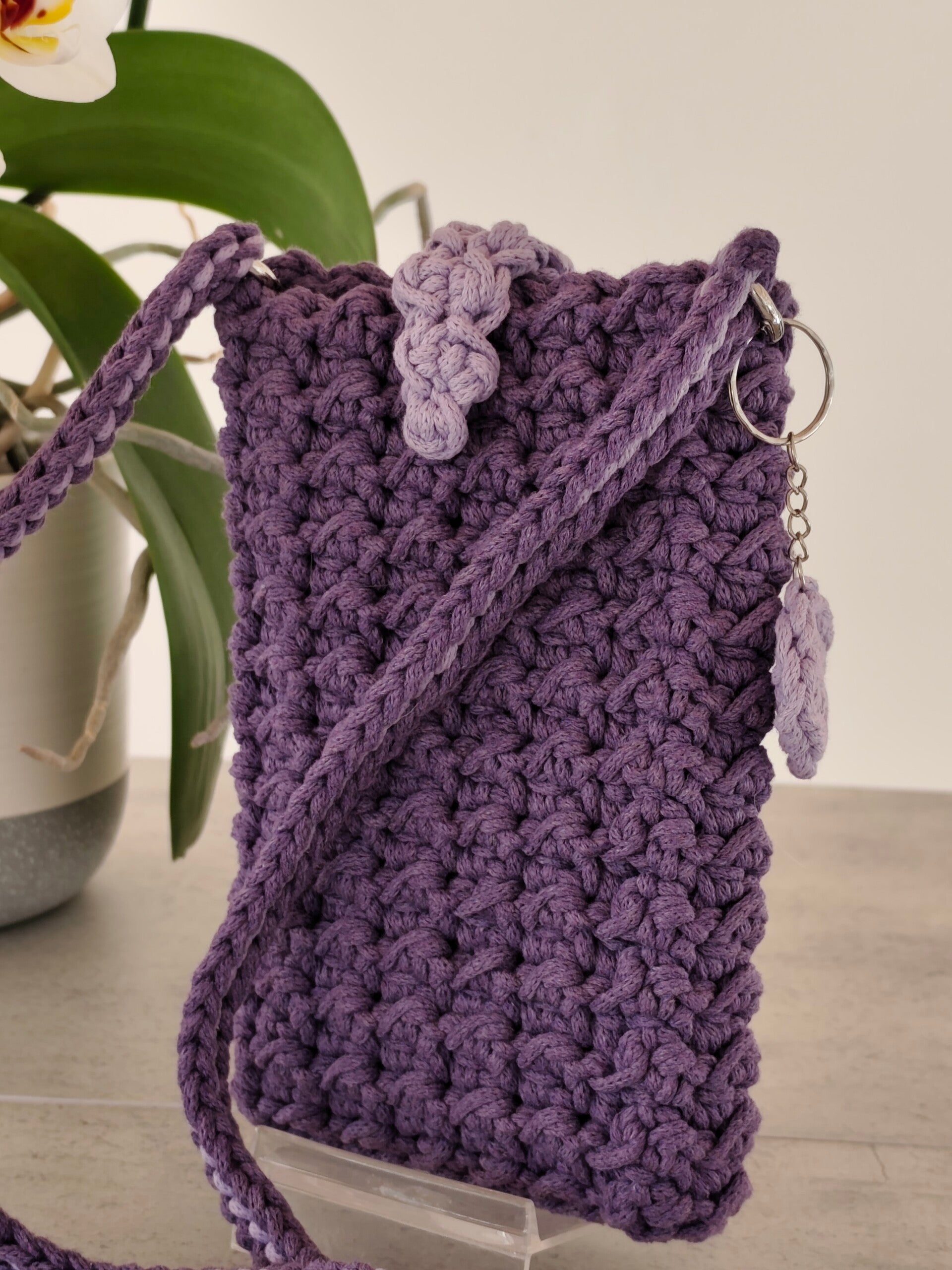 Cette superbe pochette téléphone Poky est solide et chic, elle a une largeur de 12,5 cm environ et une hauteur de 20 cm, sa anse bandoulière en lilas et violet mesure environ 1,04 mètre.
